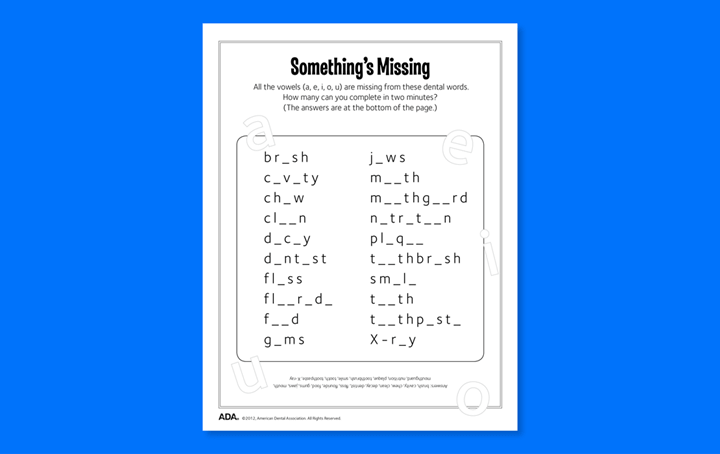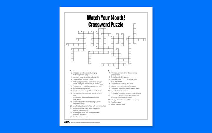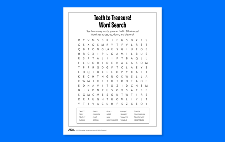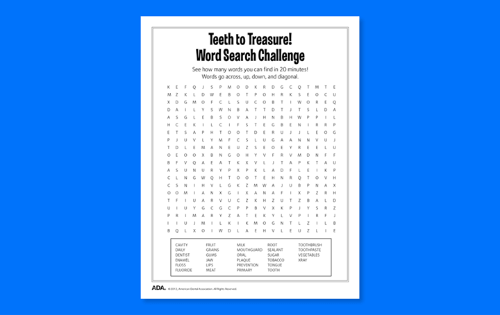 Celebrating National Puzzle Day: Dental Puzzle Games for Kids To celebrate National Puzzle Day, we’ve collected some fun dental puzzles to do with your kids – courtesy of Mouth Healthy and the American Dental Association.Simply click on the image for the puzzle you want to do and it will open a printable pdf.Have fun! A-MAZE-ing Message (PDF) Word Decoder (PDF) Rock Your Smile Word Search (PDF) What a Tangle! (PDF) Teeth to Treasure! Word Search (PDF) Teeth to Treasure! Word Search Challenge (PDF) Something’s Missing (PDF) Finders Keepers (PDF) Flossy Crossword Puzzle (PDF) Watch Your Mouth! (PDF) Share my adventures Share this content Opens in a new window X Opens in a new window Facebook Opens in a new window Pinterest Opens in a new window LinkedIn Opens in a new window Viber Opens in a new window VK Opens in a new window Reddit Opens in a new window Tumblr Opens in a new window Viadeo Opens in a new window WhatsApp You Might Also Like How to Avoid a Cavity Nightmare After Halloween October 31, 2025 Celebrating Victoria Day: A Tribute to Our Beloved City May 19, 2025 Healthy Halloween Fun for Kids October 17, 2025 Leave a Reply Cancel replyCommentEnter your name or username to comment Enter your email address to comment Enter your website URL (optional) Save my name, email, and website in this browser for the next time I comment.